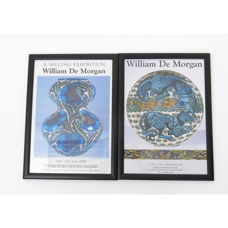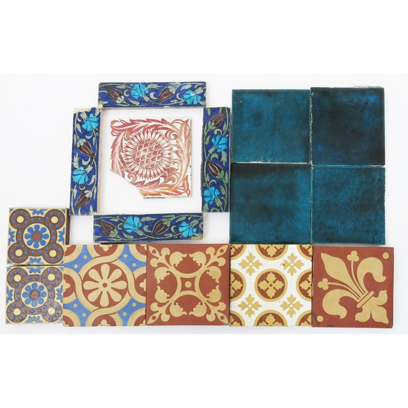 Six William De Morgan Persian border tiles, painted with carnation and tulip flowers, in shades of blue, green and aubergine on a blue ground, a ruby lustre Sunflower tile, six dark turquoise tiles and a collection of spacer and encaustic tiles by William De Morgan and other manufacturers, various marks, damages border tiles 21 x 5.5cm. (a lot).
