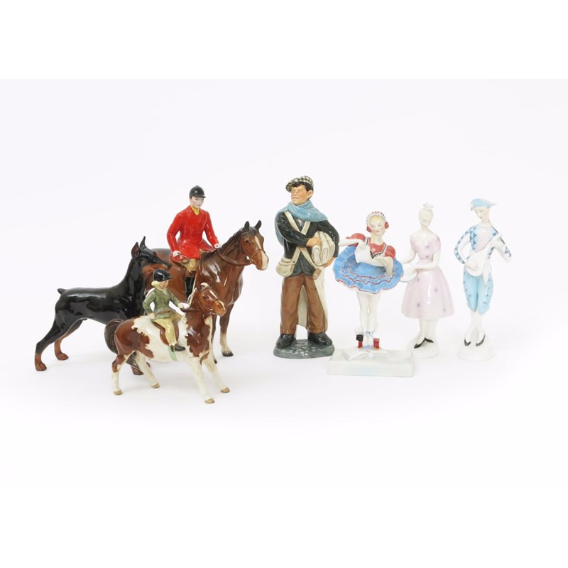 'Coppelia' Hn.3115 'Newsboy' HN.2244 'Columbine' HN.2185 and Harlequin HN.2186 four Royal Doulton figures, painted in colours, 'Girl on Pony' and 'Huntsmen' two Beswick figures and a Beswick dog, printed factory marks, Harlequin repaired, frits to Columbine,(7)