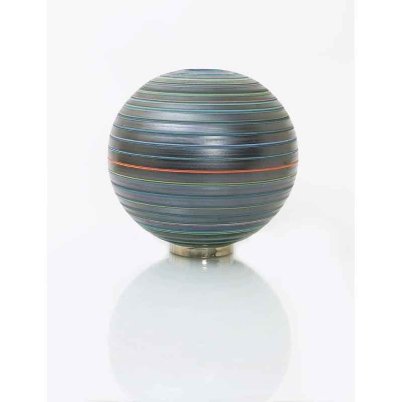 Orbit a unique Dennis Chinaworks Large Sphere vase designed by Sally Tuffin and Buchan Dennis, thrown by Rory McLeod, decorated by Natasha Chapman-Cox, painted with bands in colours, silver and metal oxide, impressed and painted marks, WW1, 2016, 36cm. high
