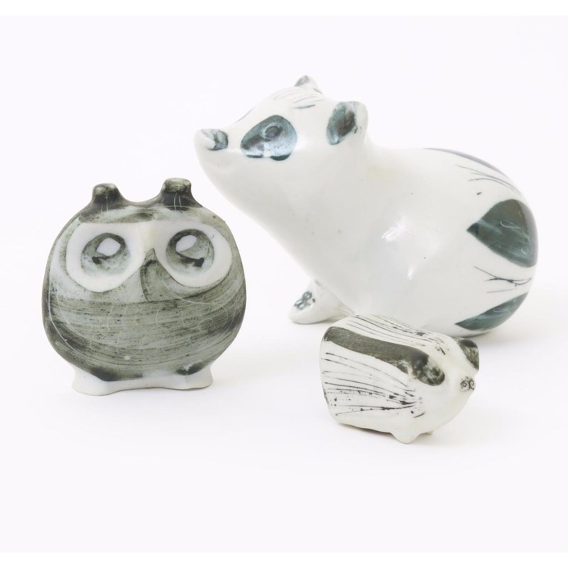 A Richard Parkinson Pottery 'Pocket' owl designed by Susan Parkinson, matt glazed in blue on a white ground, another Parkinson pottery pig and a money-box pig signed SP to tail, 7.5cm. high (Owl) (3).