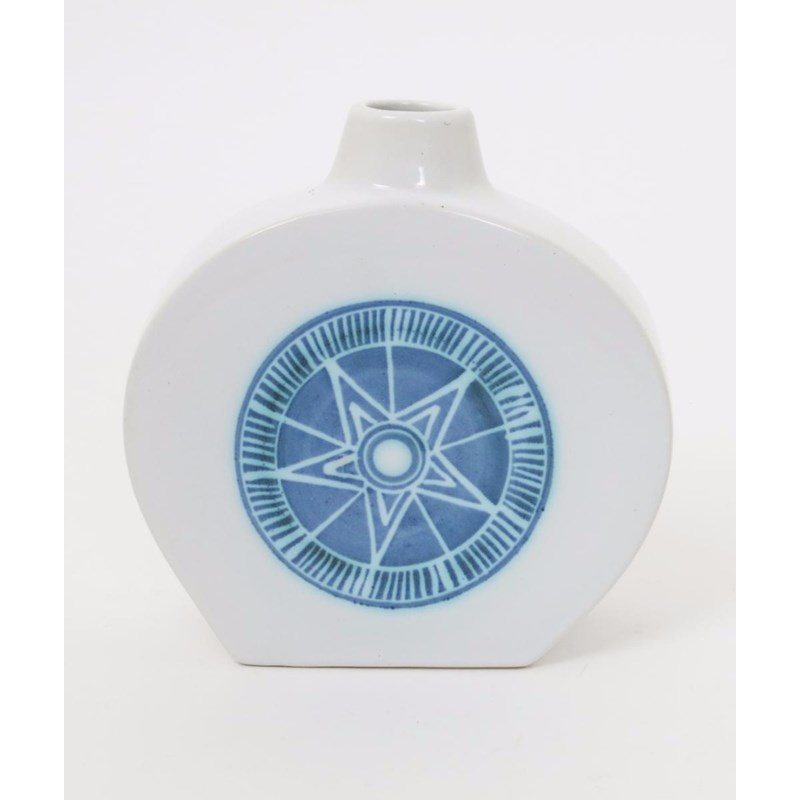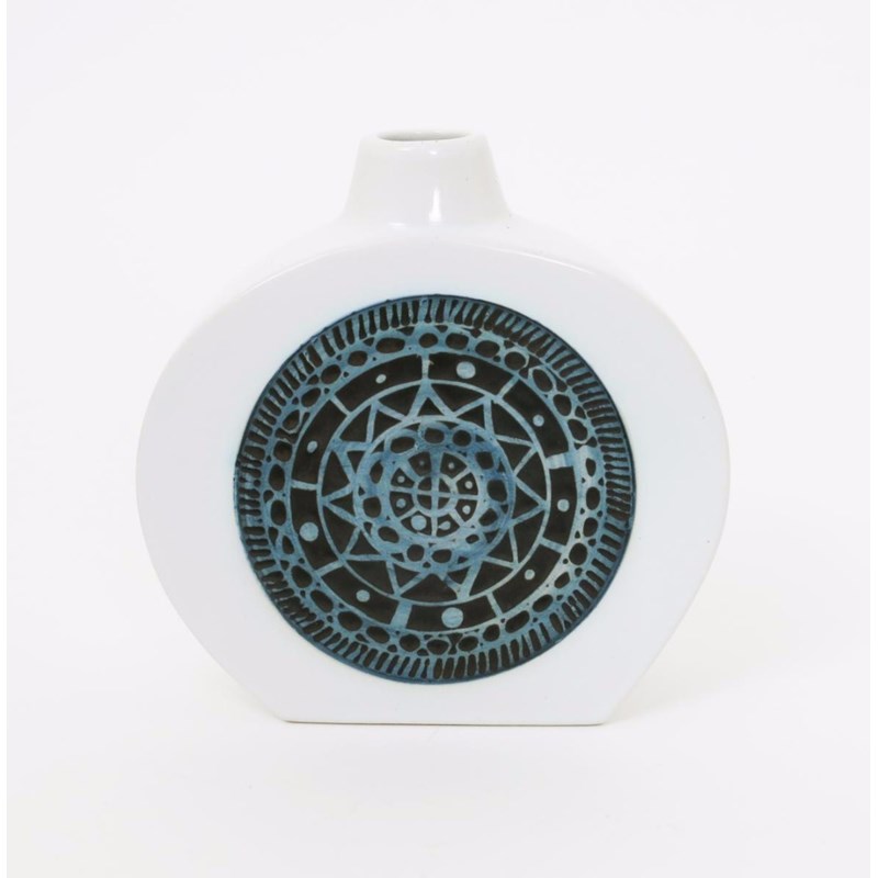 A Troika Pottery large Bottle vase, flat disc form with tapering cylindrical neck, resist decorated with a flowerhead roundel in black and blue on a white ground, painted Troika Cornwall England mark, 17cm. high