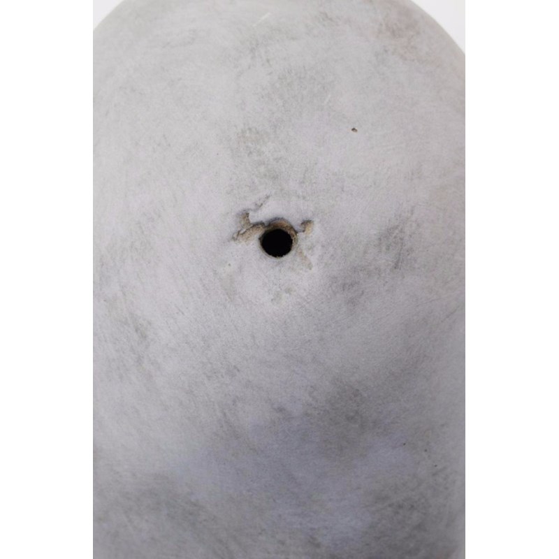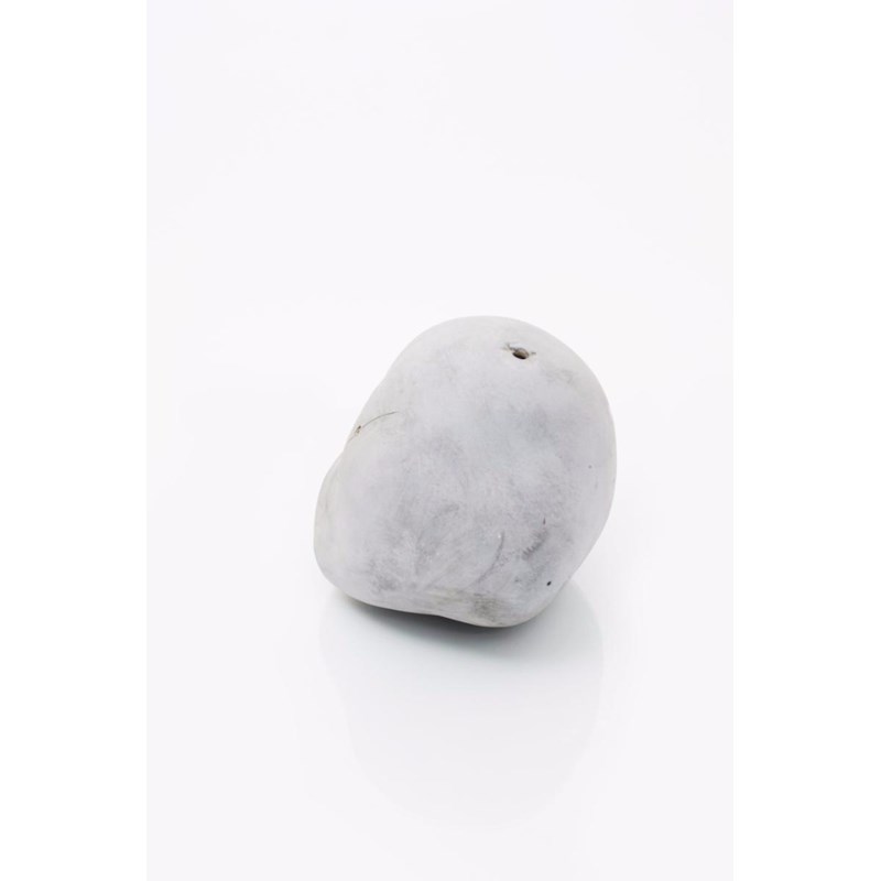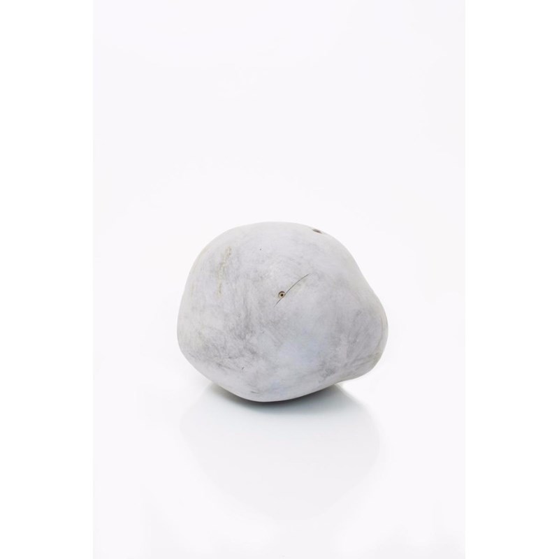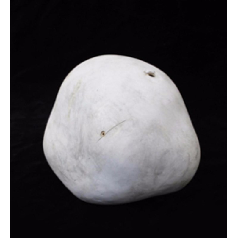 Sky Grey Vessel with Two Holes and a Line, 1997, a stoneware hand-built pebble form covered with thick applied white paint, incised GB monogram, 97, 26cm. wide.