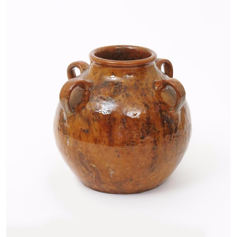 a Fremington Pottery ovoid vase with four loop handles, covered in a mottled brown running glaze incised E B Fishley Fremington N Devon 22cm. high