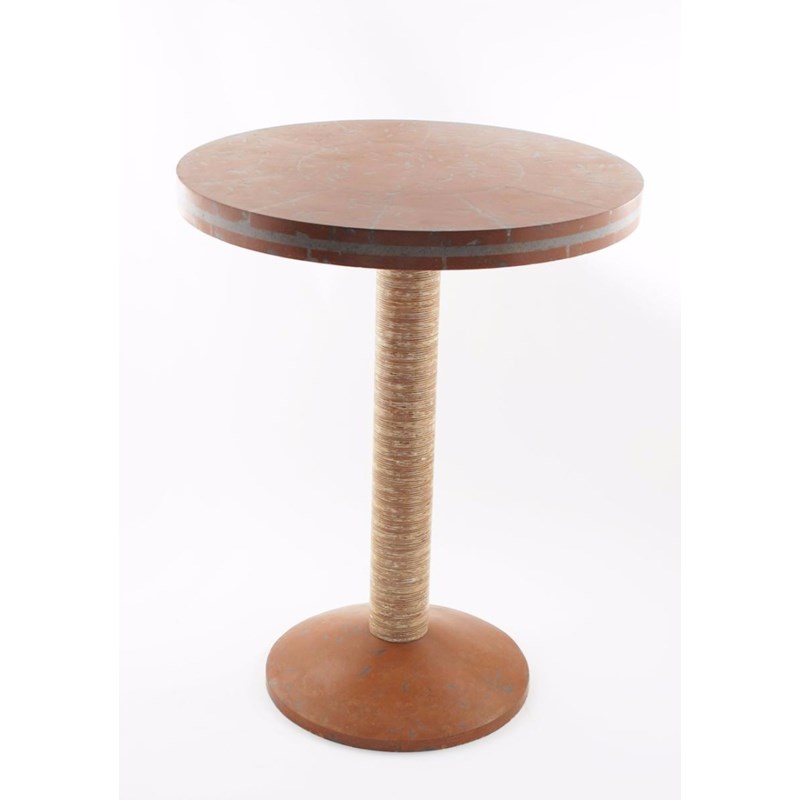 a unique red earthenware table, 1988, red earthenware tiles with glass cement, on turned, birch laminate plywood, and red earthenware foot chips to foot rim 69cm. high, 54cm diam.