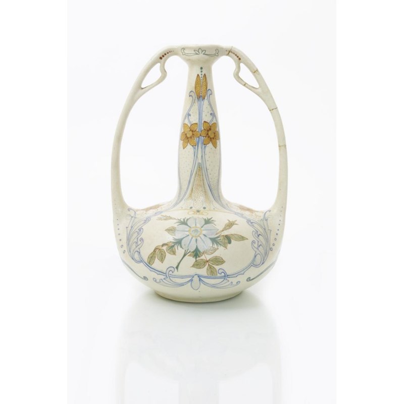 An Art Nouveau Arnhem pottery vase, the compressed body with pierced, slender twin-handles, painted with panels of flowers and foliage, in colours on a matt cream ground, printed and painted marks, JK monogram 177, one handle repaired,. 33cm. high