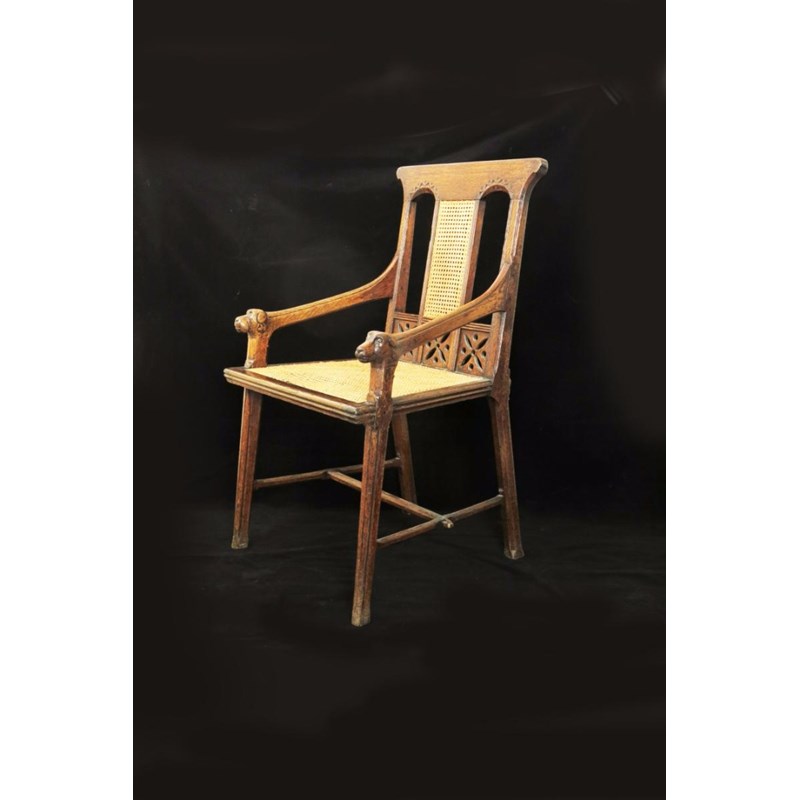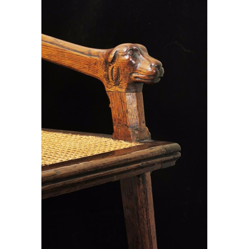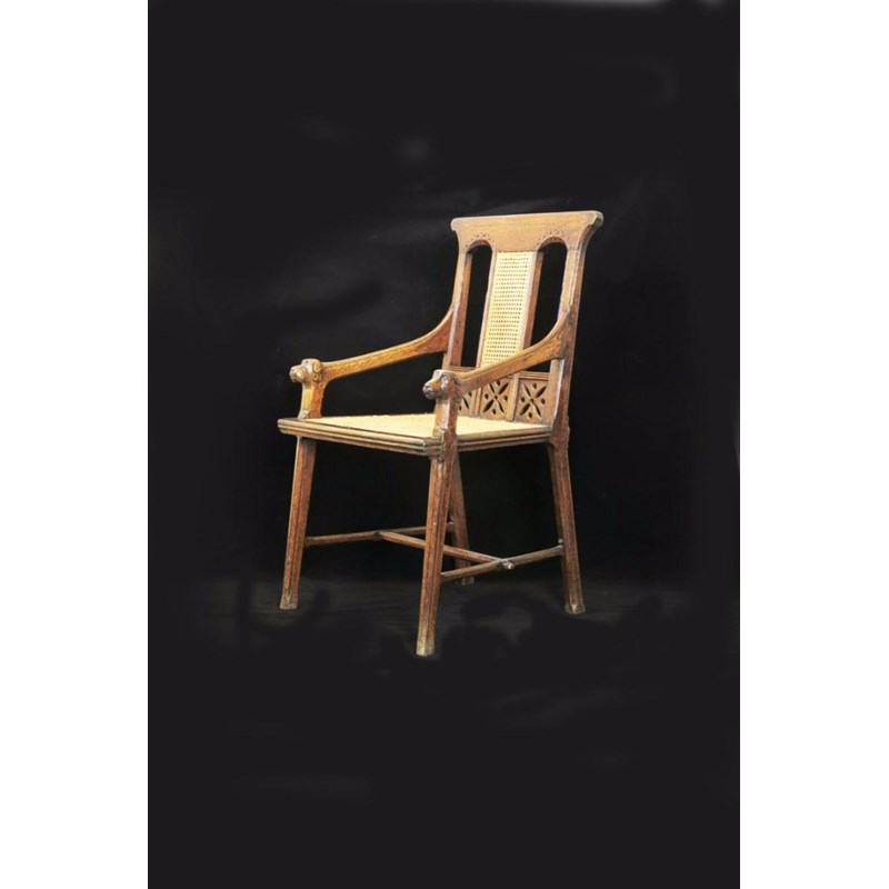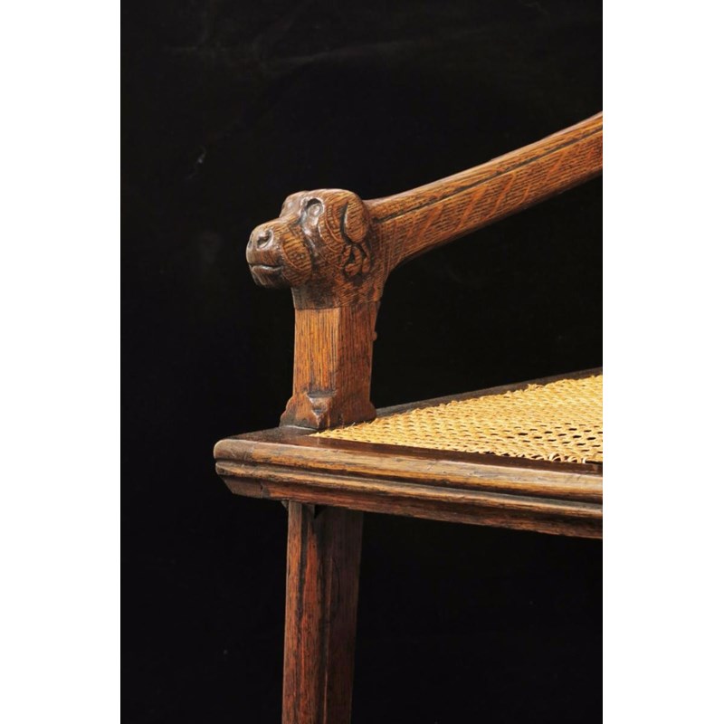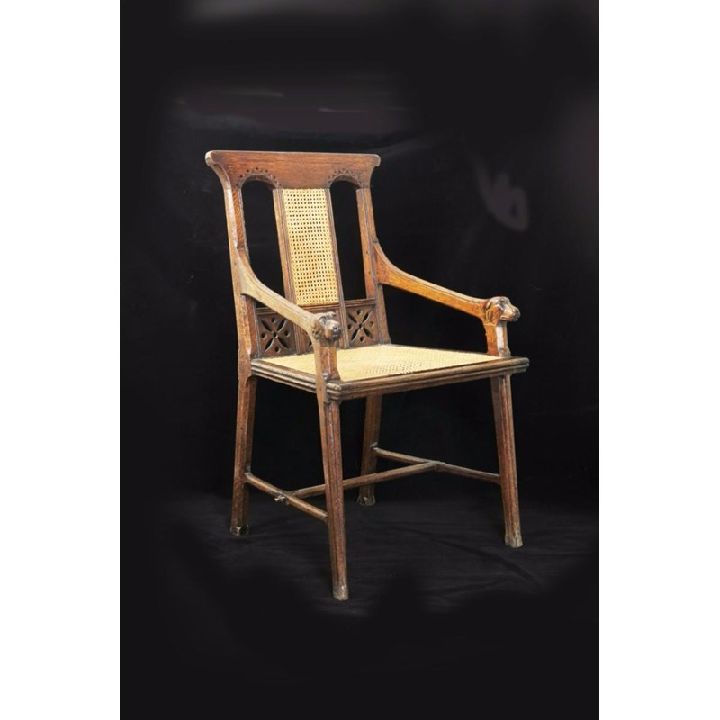 An oak armchair in the manner of John Pollard Seddon, flaring carved legs with pegged stretcher, the open back with pierced and carved stylised foliate panels below carved geometric arches inset with ebony, the arms with carved dog's head terminals, with new cane seat and back, 87cm. high