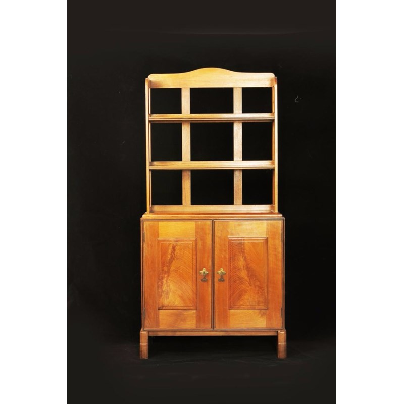 A walnut cupboard with bookshelves by Peter Waals, the twin compartment cupboard with single shelf, patinated hinges and hand wrought patinated brass drop handles probably by Alfred Bucknell, with dovetail joints, sleigh feet and simple ebonised wood inlaid bead borders, 124cm. high, 60.5cm. wide, 27cm deep.