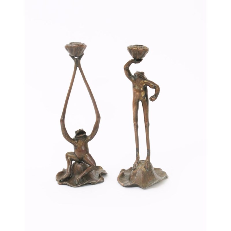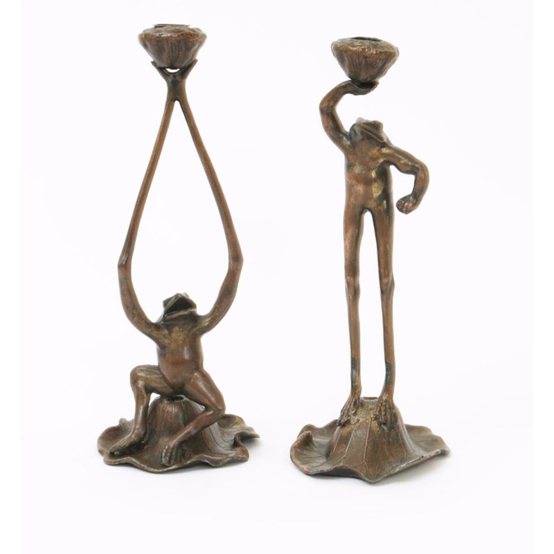 A pair of Aesthetic Movement patinated metal frog candlesticks retailed by Liberty & Co, one modelled seated on a lily pad, his long arms supporting a sconce, the other long legged frog standing on the lily pad and holding up a sconce, unsigned 29.5cm. high, (2)