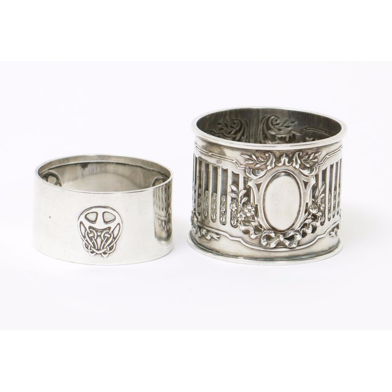 A Liberty & Co silver napkin ring designed by Archibald Knox, cast in low relief with Art Nouveau entwined knot panel, and another silver napkin ring, stamped marks, Birmingham 1903, 5cm. wide. (2).