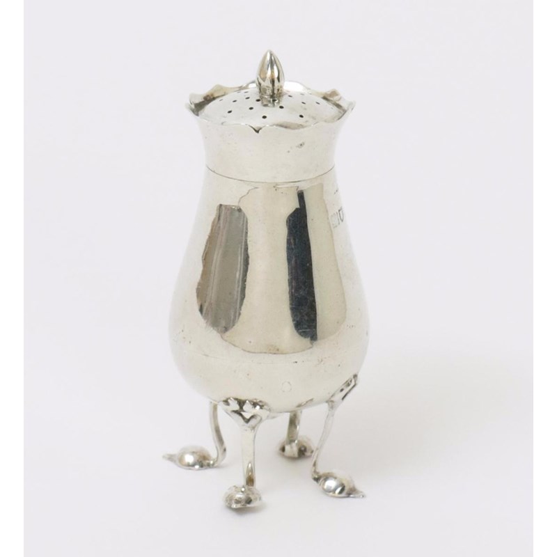 A silver pepper pot probably by A.E. Jones, model no.408, raised on four foliate feet, indistinct stamped marks, 8.5cm. high