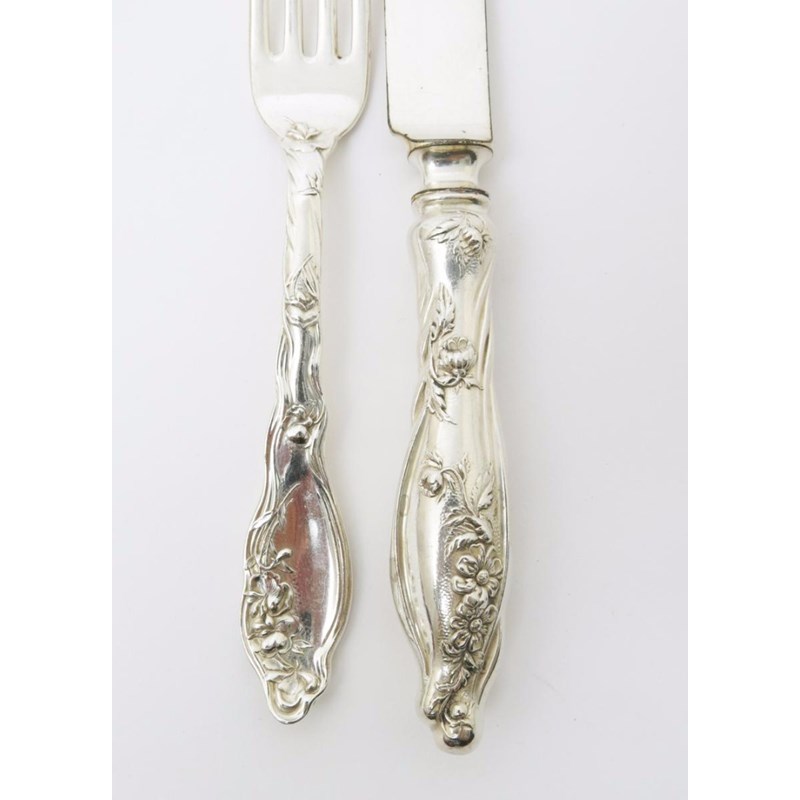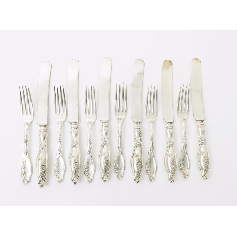 Six Aesthetic Movement silver dinner knives and forks, the handles cast in low relief with simple flower sprays stamped Sterling to forks, 25cm. long (knives), (12)
