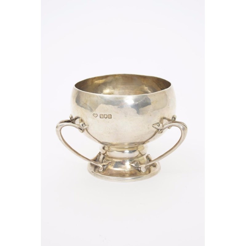 A Goldsmith's & Silversmith's silver footed cup, with three applied loop handles, hammered finish, London 1906 10cm. high