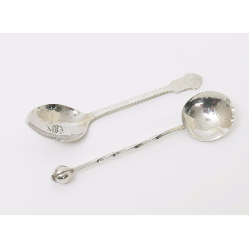 An A.E. Jones silver spoon, the circular bowl with twist stem and bud finial, and another A.E.Jones silver spoon stamped marks, Birmingham 1915, 13.5cm. long (2)