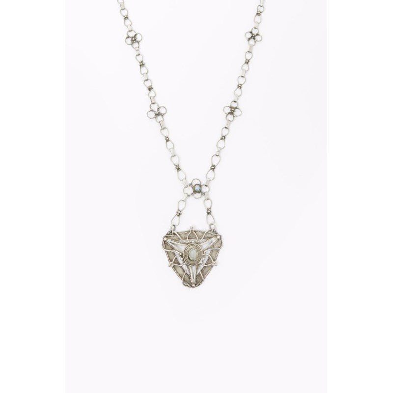 An Arts and Crafts silver and opal necklace, wirework triangular form set with central opal stone, inscribed to reverse 24.7.1912 Of Hol Herte Cometh Hope, a quote from Piers Plowman 3.5cm. long