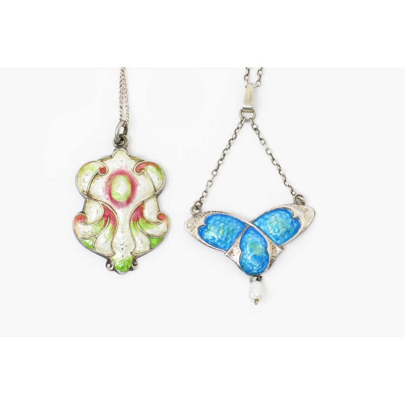 A Pendelton & Sons silver and enamel pendant necklace, trilobed form enamelled in blue and green, with freshwater pearl drop, and another enamelled silver pendant necklace, stamped marks, PAS Birmingham 1909, 3cm. wide, (2).