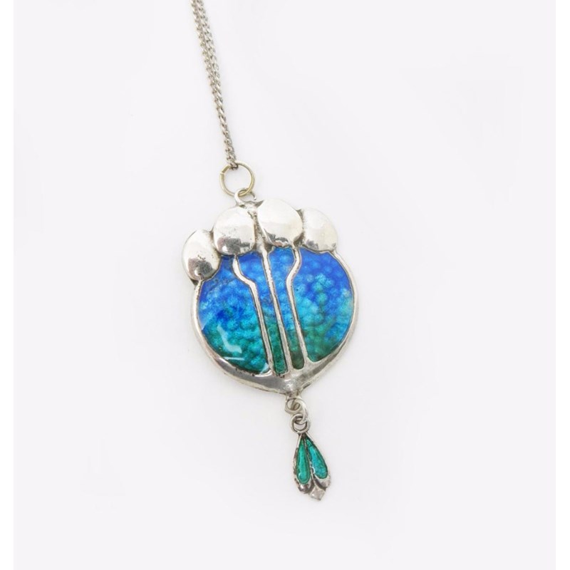 A James Fenton silver and enamel pendant necklace, cast in low relief with stylised honesty stems, enamelled blue and green, with green enamel drop, stamped marks JF Birmingham 1909, 4cm. long.