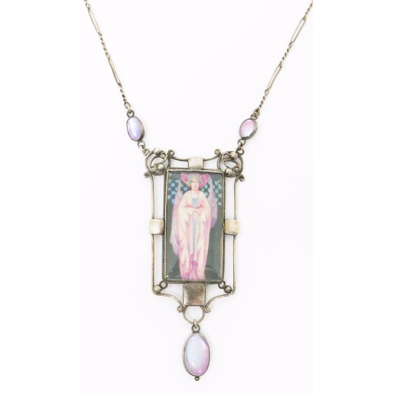 An Arts and Crafts silver necklace in the manner of R.C. Price, the wirework frame set with central rectangular painted panel of a female saint possibly by Averil Burleigh, set with amethyst drop, the wirework link necklace with panels and amethysts unsigned 9cm. high