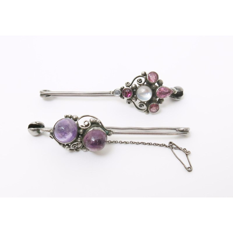 A silver and amethyst mounted pin the design probably by Dorrie Nossiter, the two amethyst stones set in simple wirework border, and another similar unsigned 7.5cm. wide (2)