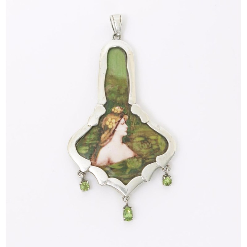 A Continental silver and peridot pendant necklace, the shaped frame with central panel of a water nymph, set with three peridot drops, stamped mark 7cm. long.