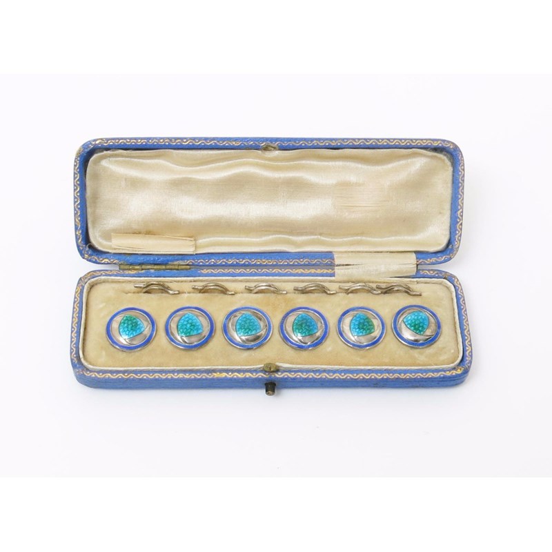 A set of six James Fenton silver and enamel dress buttons, in original fitted case, circular, cast in low relief and enamelled in shades of blue and green stamped marks, Birmingham 1908, 1cm. wide.