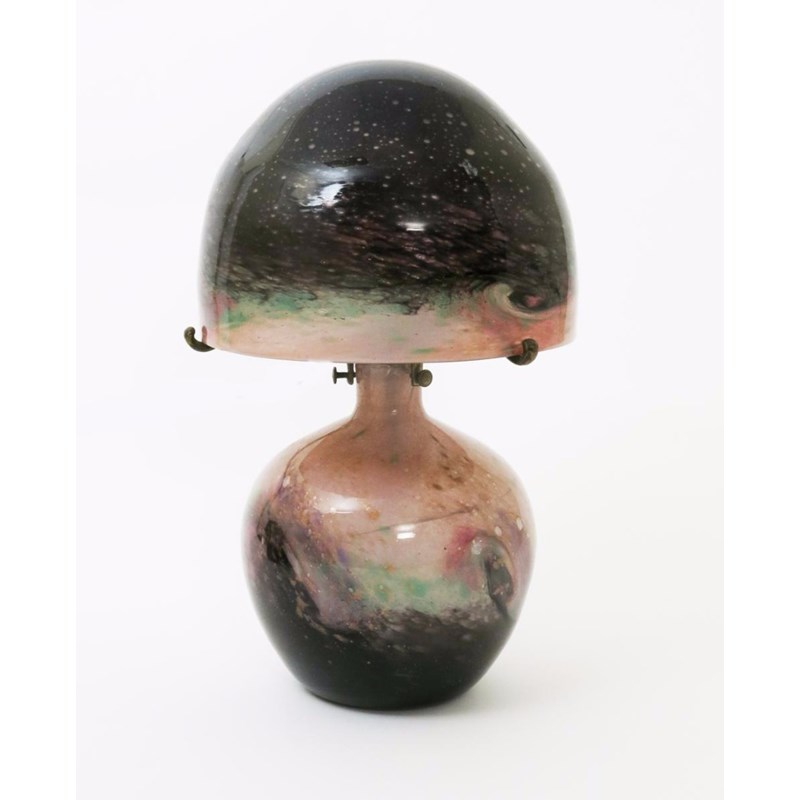 A Monart glass table lamp, model V 13:392, the ovoid vase pale pink graduating to purple with green spots and aventurine inclusions, the domed cover purple graduating to pink with whorls and aventurine inclusions, with metal mount applied paper labels, damages 42cm. high