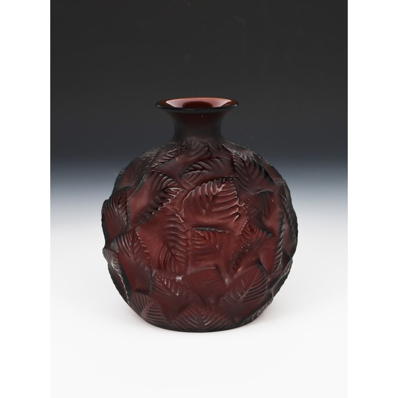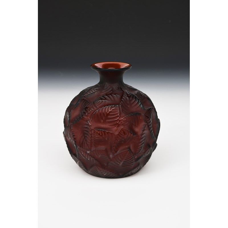 'Ormeaux' no 984 a red clear and frosted glass vase designed by Rene Lalique, moulded in relief, stencilled R Lalique France No 984, 16.5cm. high