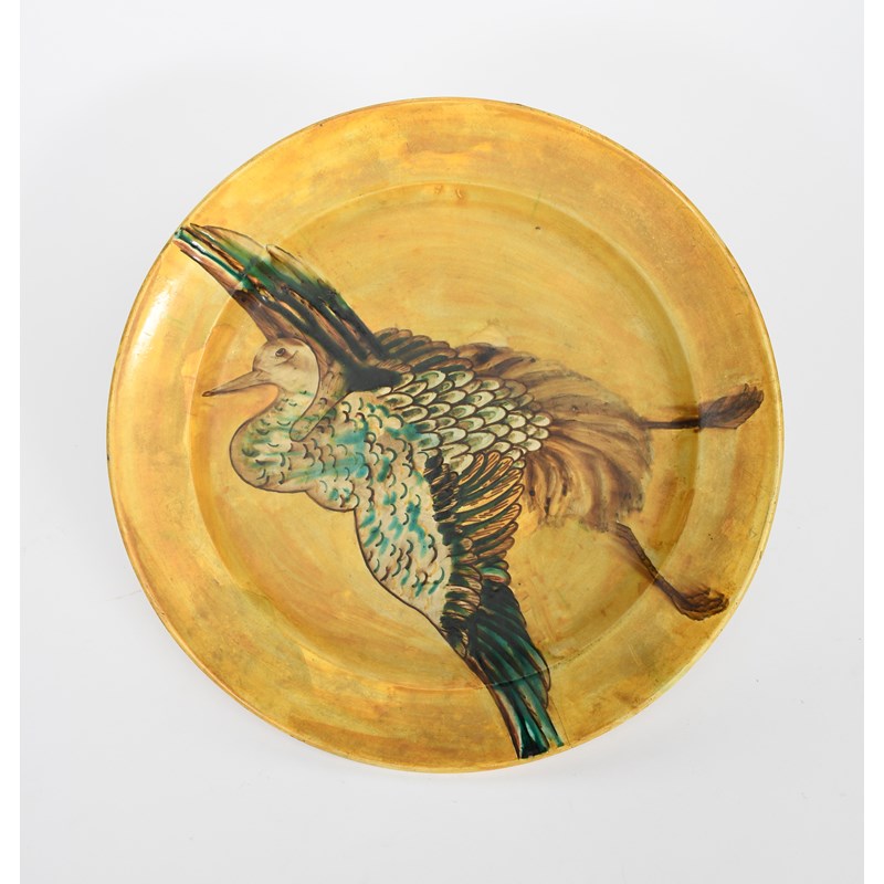 A rare Gateshead pottery charger designed by John George Sowerby, painted with a flying bird, in green, white and ochre on a yellow ground, painted factory mark and monogram, 36cm. diam.