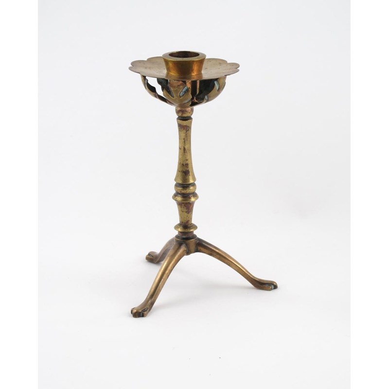 A William Arthur Smith Benson patinated copper candlestick, floriform on tripod foot stamped WAS Benson 18cm. high