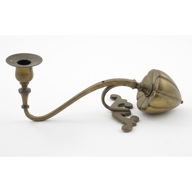 A William Arthur Smith Benson brass candlestick, scrolling stem with foliate feet, the circular sconce balanced with a seedpod counterweight unsigned 31cm. wide