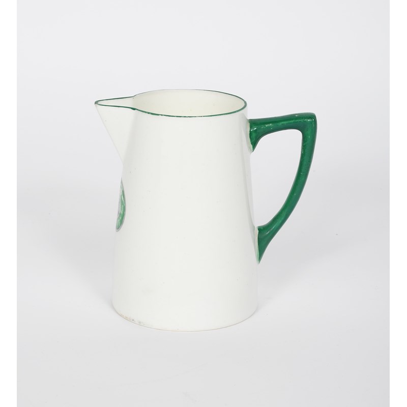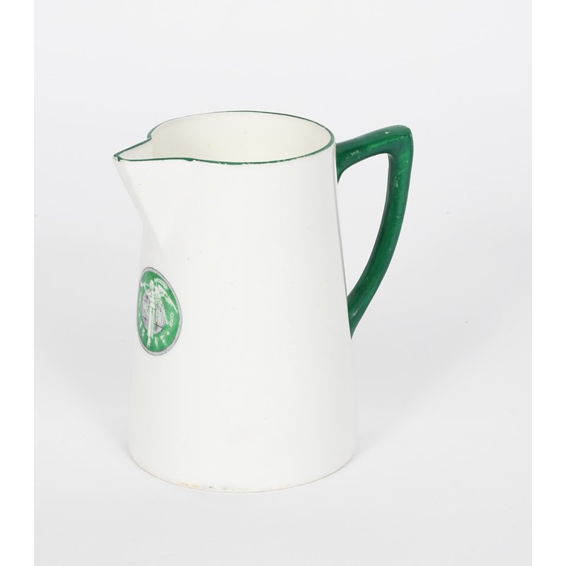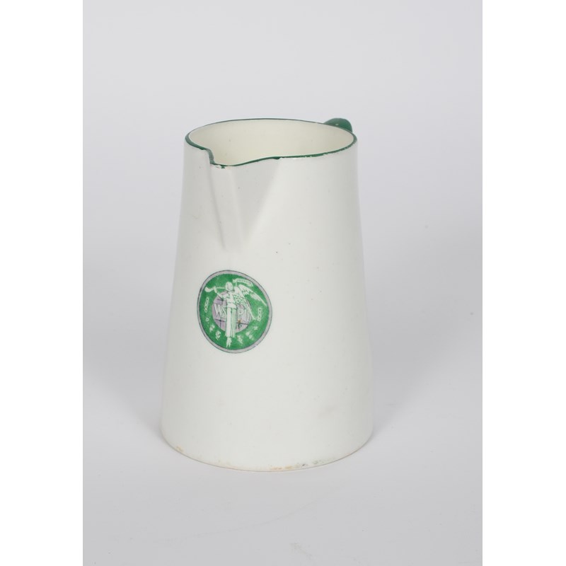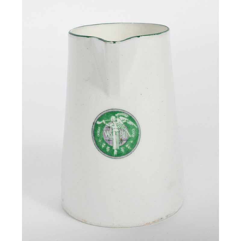 A Williamsons Longton Suffrage milk-jug, printed with the Suffragette WSPU trumpeting angel roundel for the Women's Social and Political Union, in green and violet below the spout, printed factory mark, 13cm. high