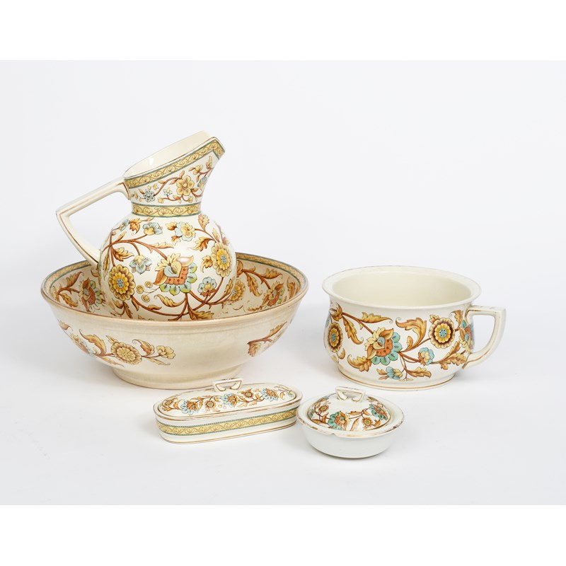 An Old Hall Indiana wash set designed by Dr Christopher Dresser, printed in colours on a cream ground with scrolling geometric flowers and foliage, comprising wash basin and ewer, chamber pot, brush pot and cover, soap dish, drainer and cover, printed marks, minor damages, 41cm diam. (wash basin), 34cm. high (ewer) (8)