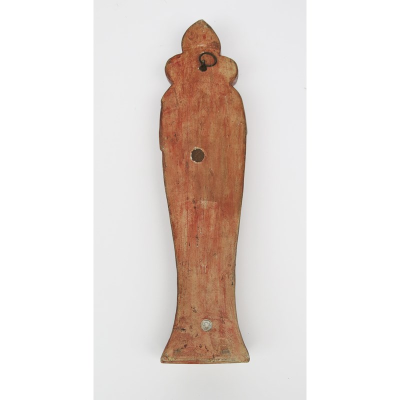 A Compton Potter's Art Guild plaque of an angel, modelled standing enclosed by her wings, holding a circular medallion with three pointed star (Trinity), below a flame motif, in shades of red highlighted in gilt unsigned, 31cm. long