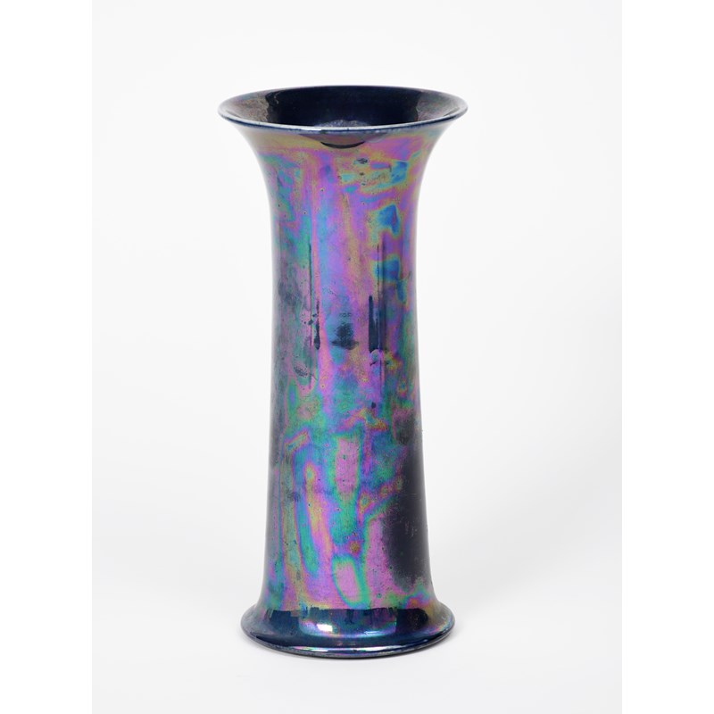 A Ruskin Pottery Kingfisher Lustre stoneware vase by William Howson Taylor, dated 1906, tapering cylindrical form on small flaring foot, with flaring neck, covered in a petrol lustre glaze impressed marks, 25cm. high