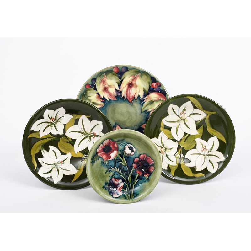 Leaf and Berry a Moorcroft Pottery plate, tubeline decorated to the rim with a band of leaf and berry in shades of pink, purple, yellow and green on a green ground, two Moorcroft Bermuda Lily bowls designed by Walter Moorcroft and a Moorcroft Pottery Anemone plate impressed marks, painted signature, 29cm. diam. (4)