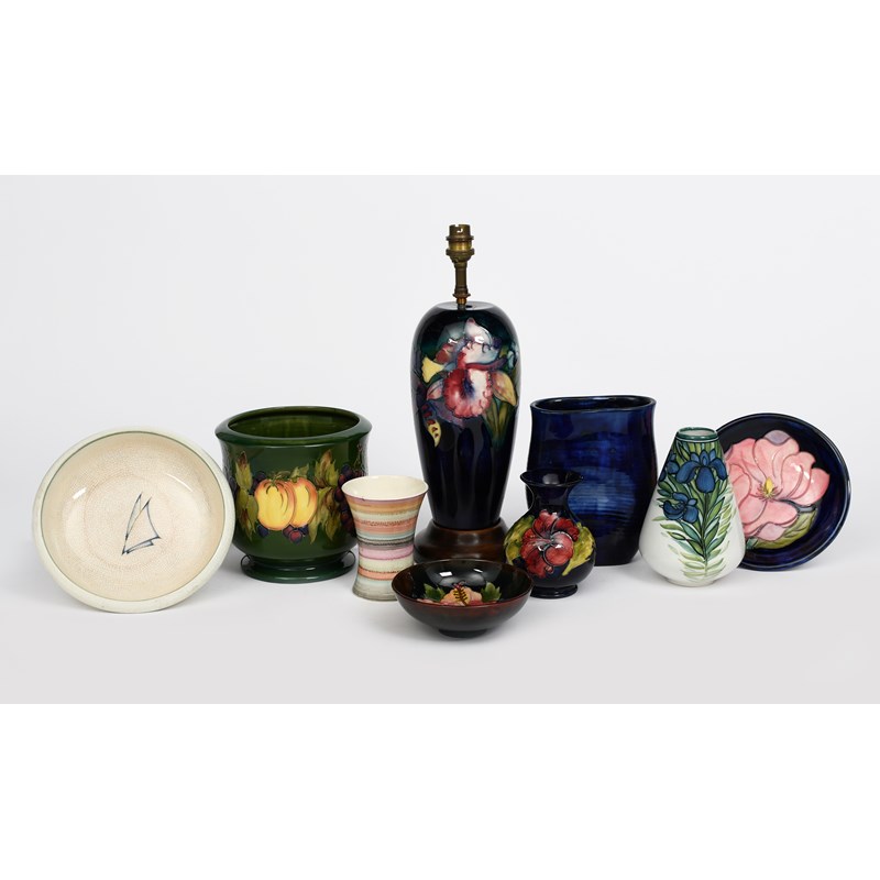 Frilled and Slipper Orchid a Moorcroft Pottery lamp base, painted in colours on a blue ground, on wooden base with a modern paper shade, a Moorcroft Pottery Yacht bowl, a Leaf and Berry jardiniere designed by Marjorie Kubanda, a Hibiscus vase and flambe bowl, a Magnolia dish, two Moorcroft Pottery Studio Ware vases and a continental pottery vase impressed marks, 27cm. high (lamp base excluding fittings), (9)