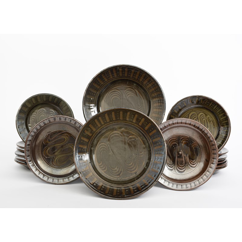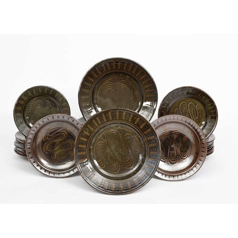 a Wenford Bridge pottery service, decorated to the well with a meandering river motif, comprising; eight various dinner plates and sixteen various side plates, glazed in tenmoku and ash, impressed seal marks, 28cm. diam. (dinner plate), (24)