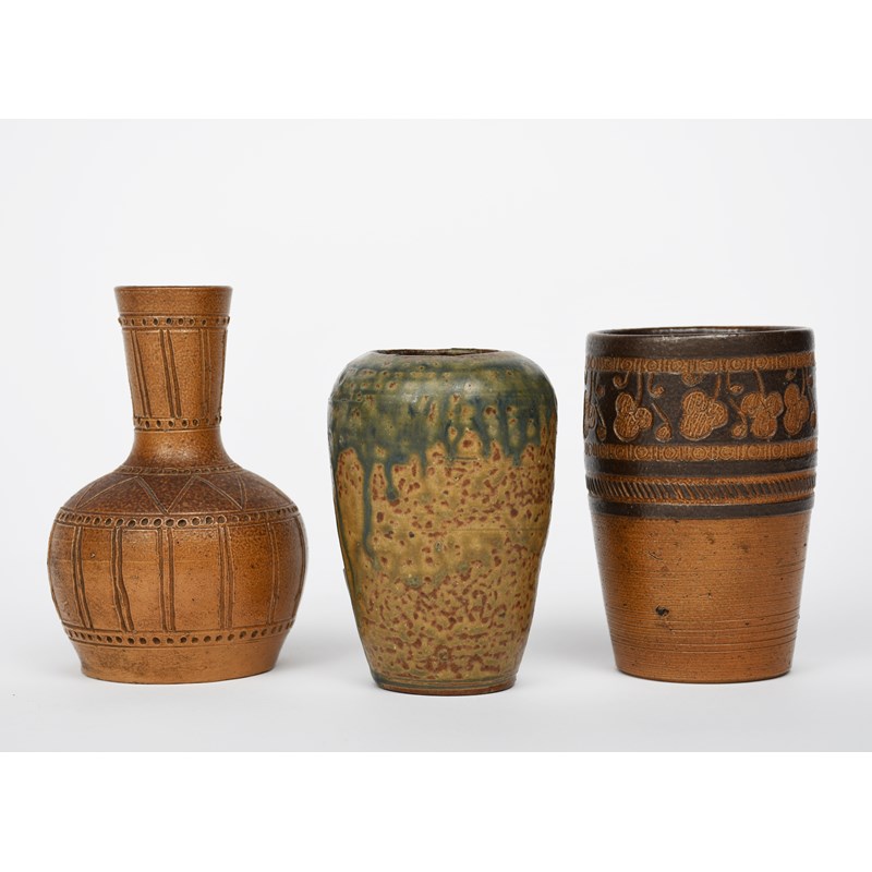 An Eugene Lion stoneware vase, shouldered form with inverted rim, with a running celadon green glaze from the shoulder, an Auguste Delaherche stoneware beaker vase incised with foliate motif, and another solifleur vase, incised mark, 11.5cm. high, (3)