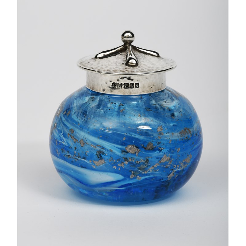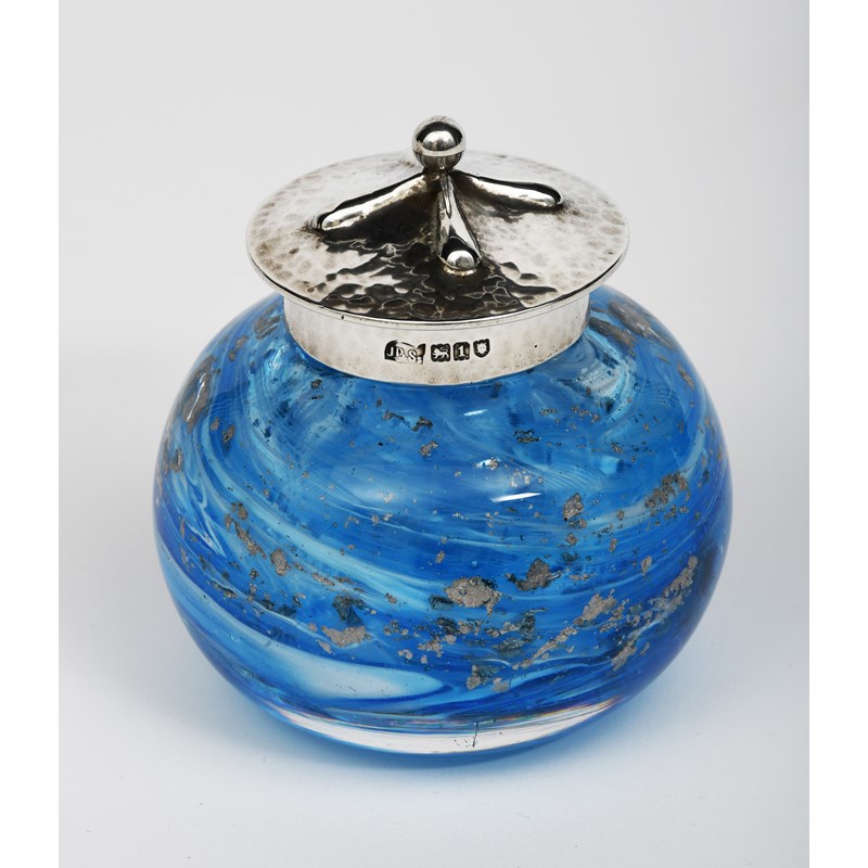 A James Powell and Sons Whitefriars glass inkwell with silver cover probably designed by Harry Powell, the spherical inkwell of thick clear glass internally decorated with blue and white swirls and silver inclusions, the silver low conical cover with four radiating panels and ball finial, hammered finish, stamed marks, JP & Ss, London 1906, 9.5cm. high, (2)