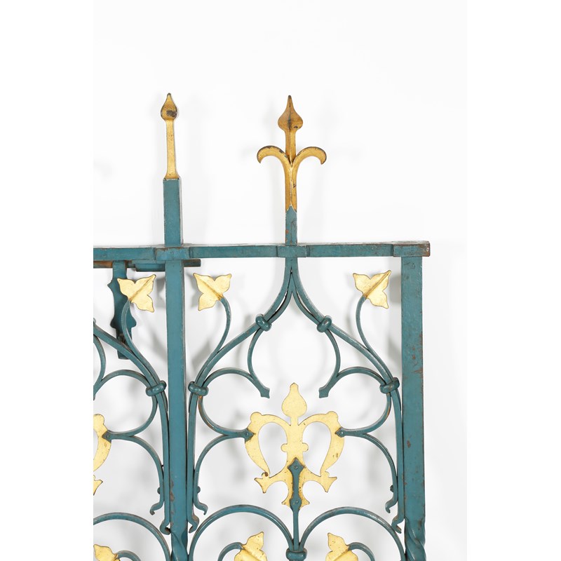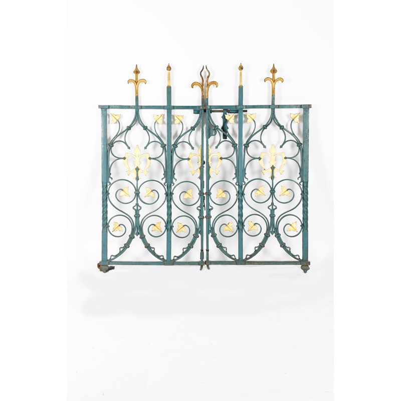 A pair of Hardman Powell & Co painted wrought iron gates for St Mary's Church Derby designed by Augustus Welby Northmore Pugin, scrolling form with gold trefoil terminals and heraldic M, below trefoil fleur de lys and points, cast Hardman Powell & Co panel, 119cm. high, 61cm wide (each), (2)