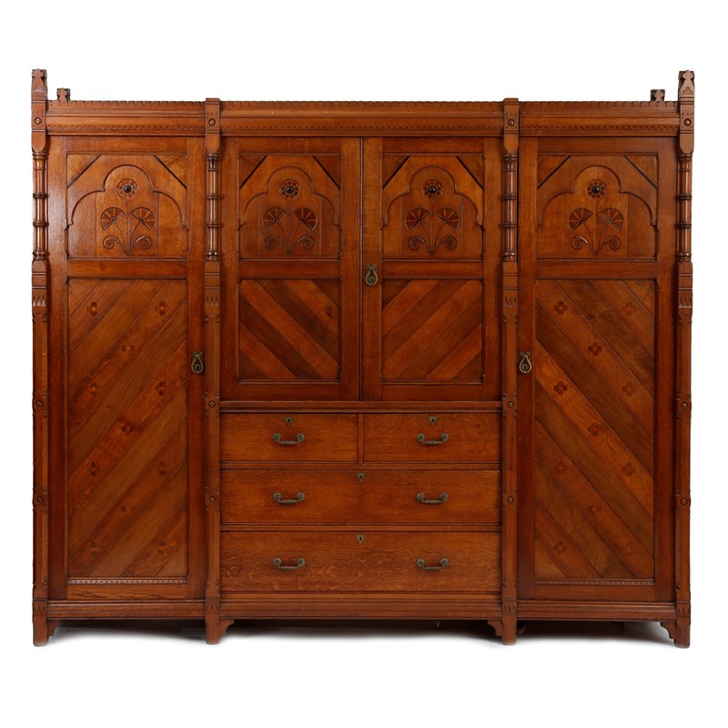 A large Holland and Sons Gothic Revival oak and walnut wardrobe designed by Bruce Talbert, in four sections, the central bank of drawers surmounted by two short hinged doors, each with inlaid stylised flowers on vertical planking with a trefoil frame, the two outer full length compartments with similar doors, framed by chamfered stiles and attached collared columns with carved finials, all below a moulded and crenellated cornice, 228cm high, 259cm wide, 61cm deep.