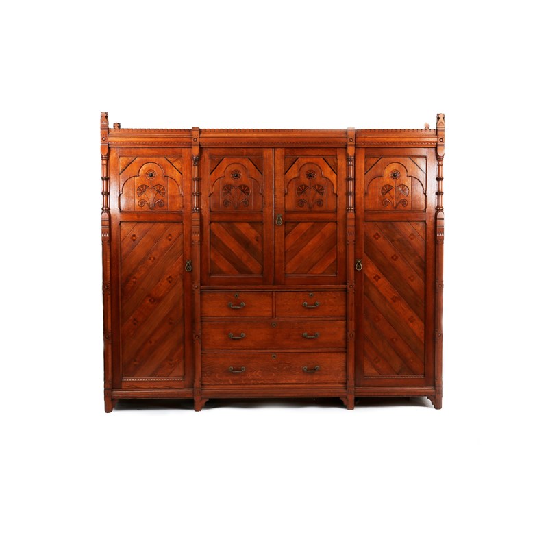 A large Holland and Sons Gothic Revival oak and walnut wardrobe designed by Bruce Talbert