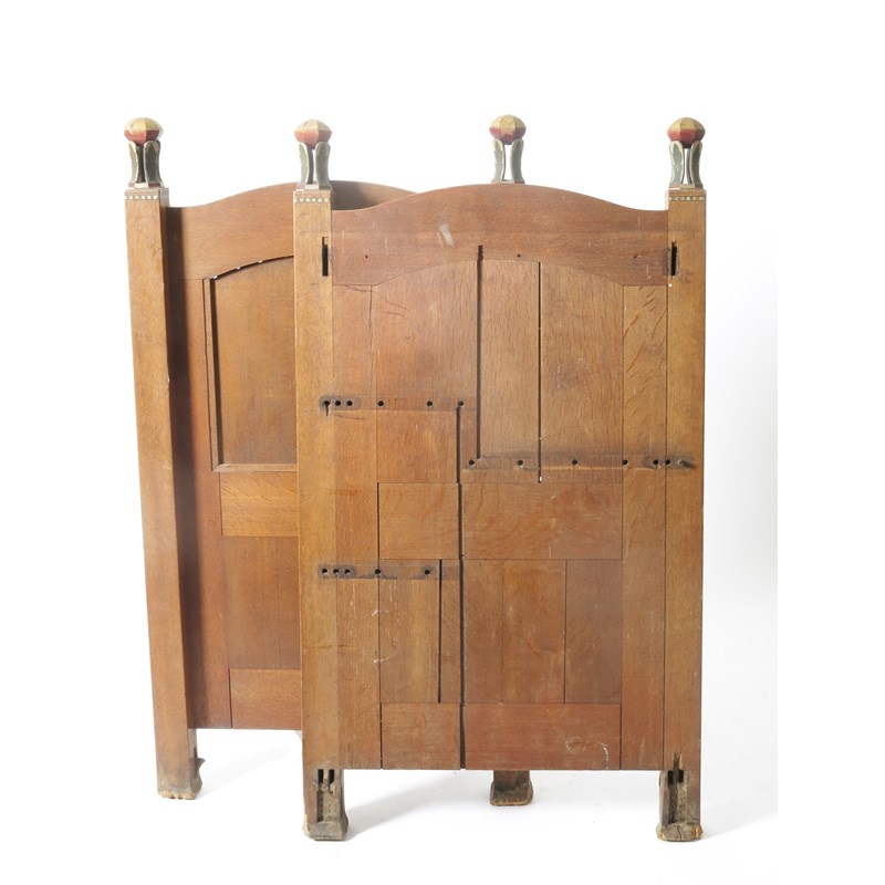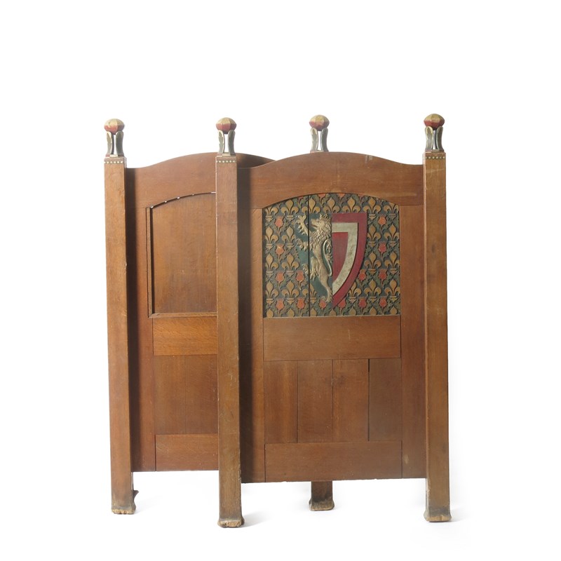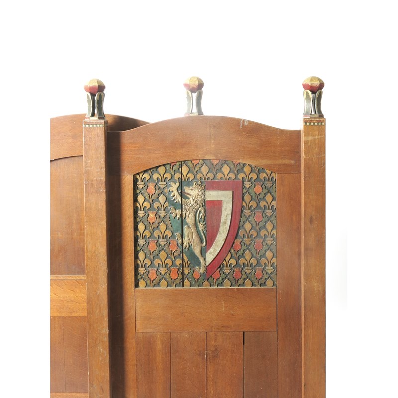 A pair of oak bookshelf ends in the manner of Charles Francis Annesley Voysey, one carved with heraldic shield for Balliol College, Oxford, the ends with carved foliate finials, 134cm. high, 73cm wide