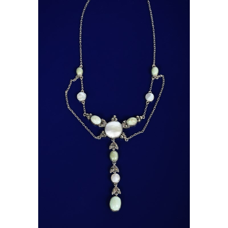 A silver and mother of pearl necklace, the link chain set with mother of pearl discs and amazonite stones, with small marcasite trefoil clusters, unsigned, 7cm. drop.