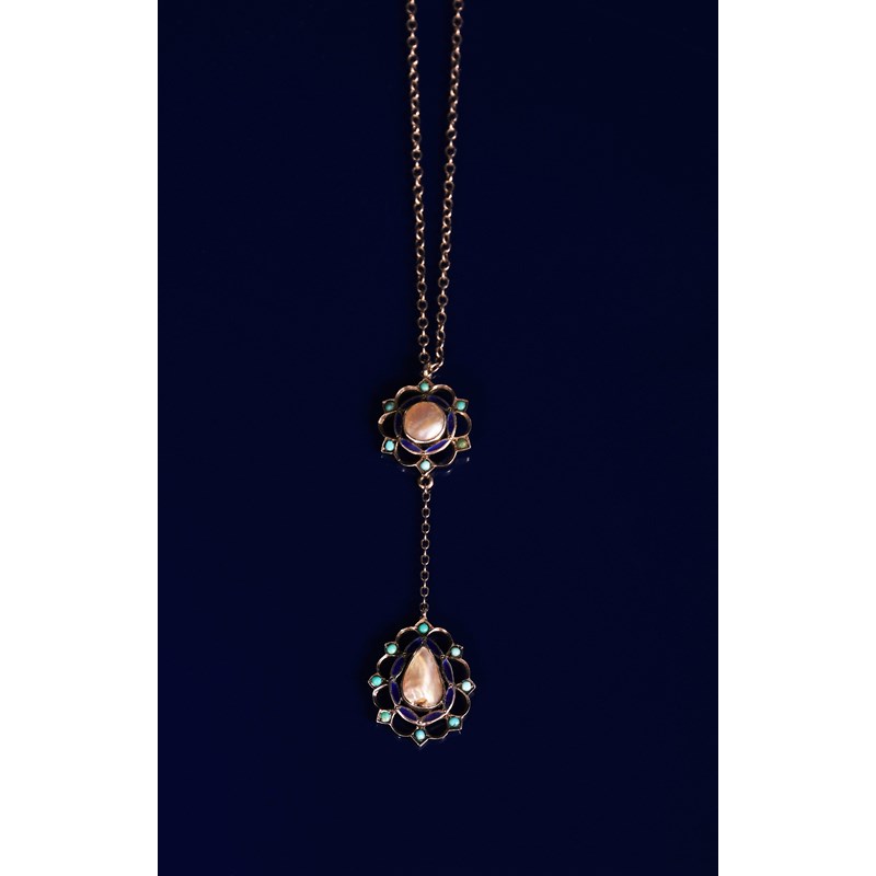 A silver and mother of pearl drop pendant necklace, flowerhead form, with blue and turquoise panels, with elliptical drop, unsigned, 5.5cm. long.