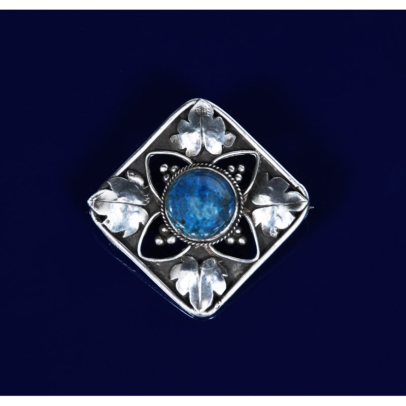 A silver brooch square section, pierced and cast in relief with four radiating leaves and berry clusters, set with central blue lapis stone unsigned, 2.6cm. square.