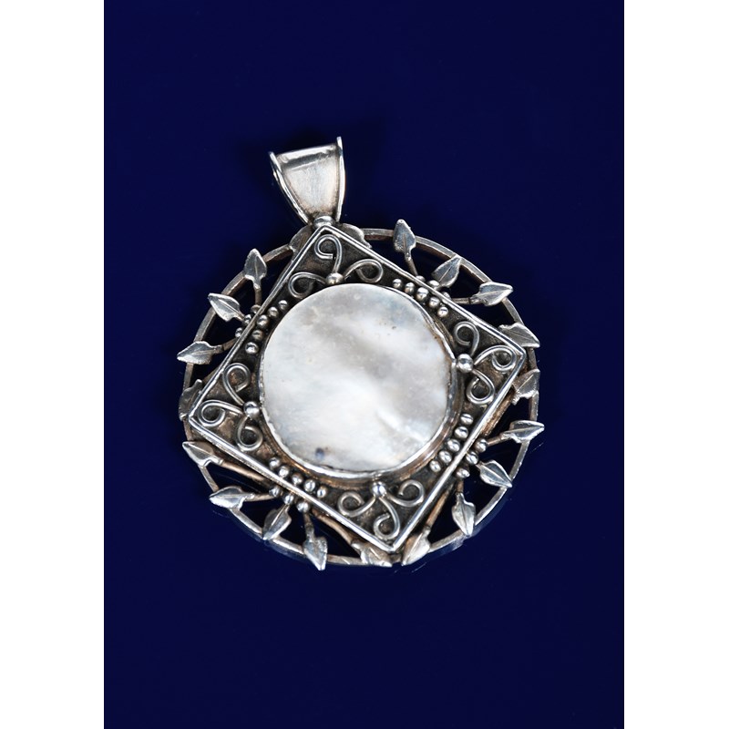 A silver pendant necklace, circular wirework frame with small leaf motif set in diamond shaped panel with wire scroll and central mother of pearl shell, 4.5cm. drop.