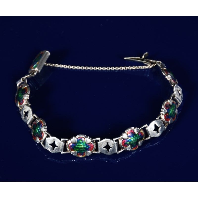 A silver and enamel bracelet, alternate silver panels one cast with flower-head motif enamelled in green, blue and red, the other a pierced aperture, rectangular clasp, with safety chain, unsigned, 19cm. long.