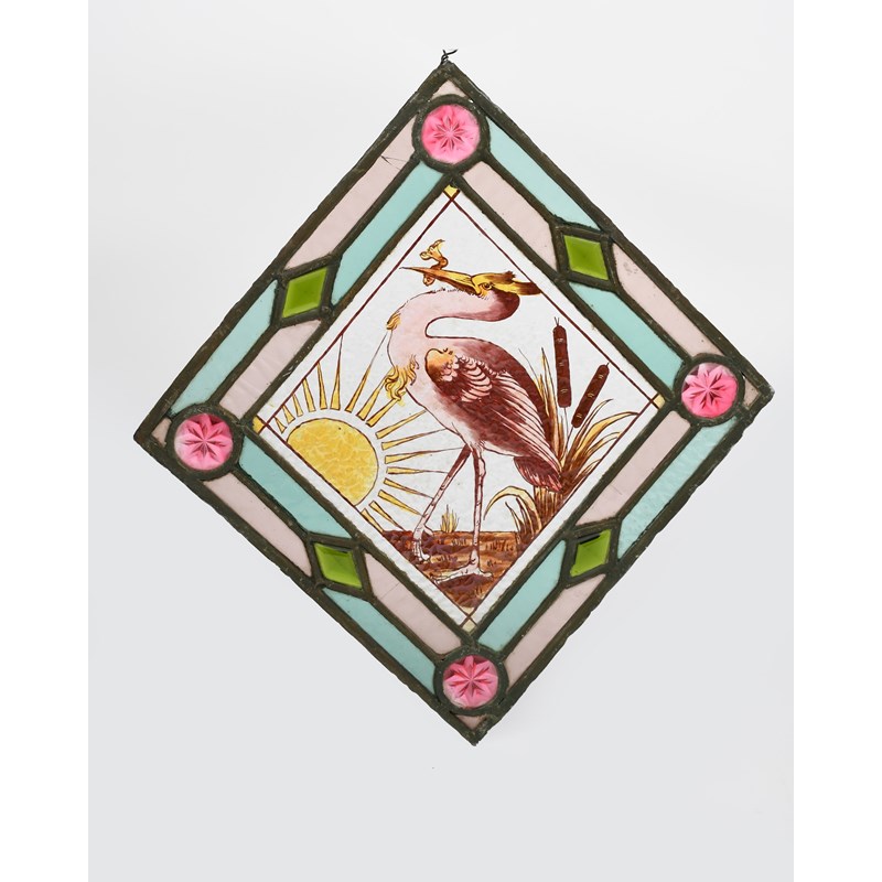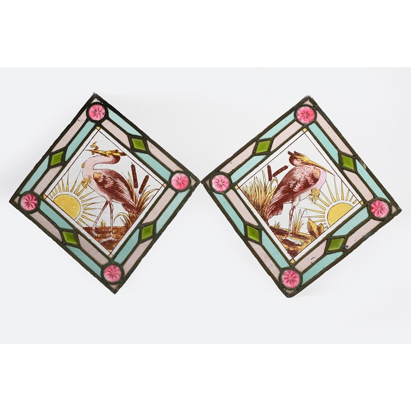 A pair of Aesthetic Movement stained glass panels, diamond shaped, painted with an anthropomorphic bird, one perched on one leg resting by bull rushes before the rising sun, the other the bird standing with a fish in its bill, beside bull rushes before the setting sun, inside coloured leaded glass border with pink and green cut glass jewels, 43cm. high, 40cm wide