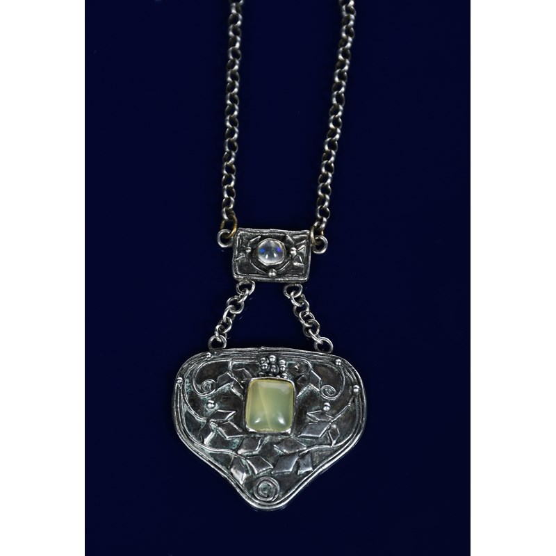 A silver and chalcedony pendant necklace, shield shape cast in low relief with berried foliage tendrils, set with rectangular chalcedony stone, below a small rectangular panel similar, set with central moonstone cabochon, on link chain, unsigned 4.5cm. drop.