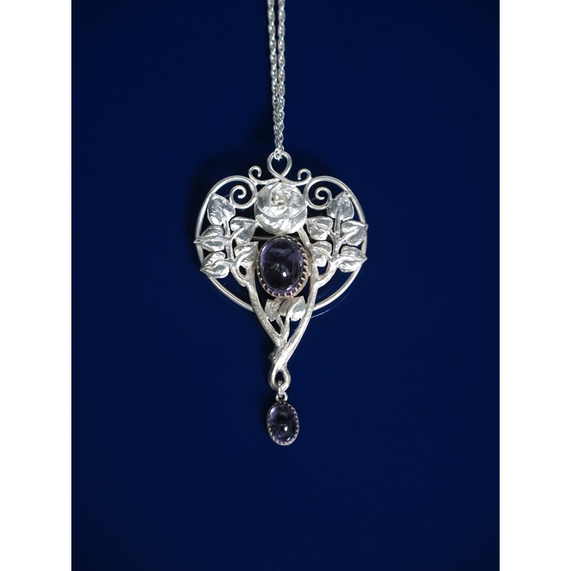 A Guild of Handicraft silver and amethyst pendant necklace, pierced and chased with a briar rose inside scroll border, set with central amethyst above amethyst drop, unsigned, 6.5cm. long